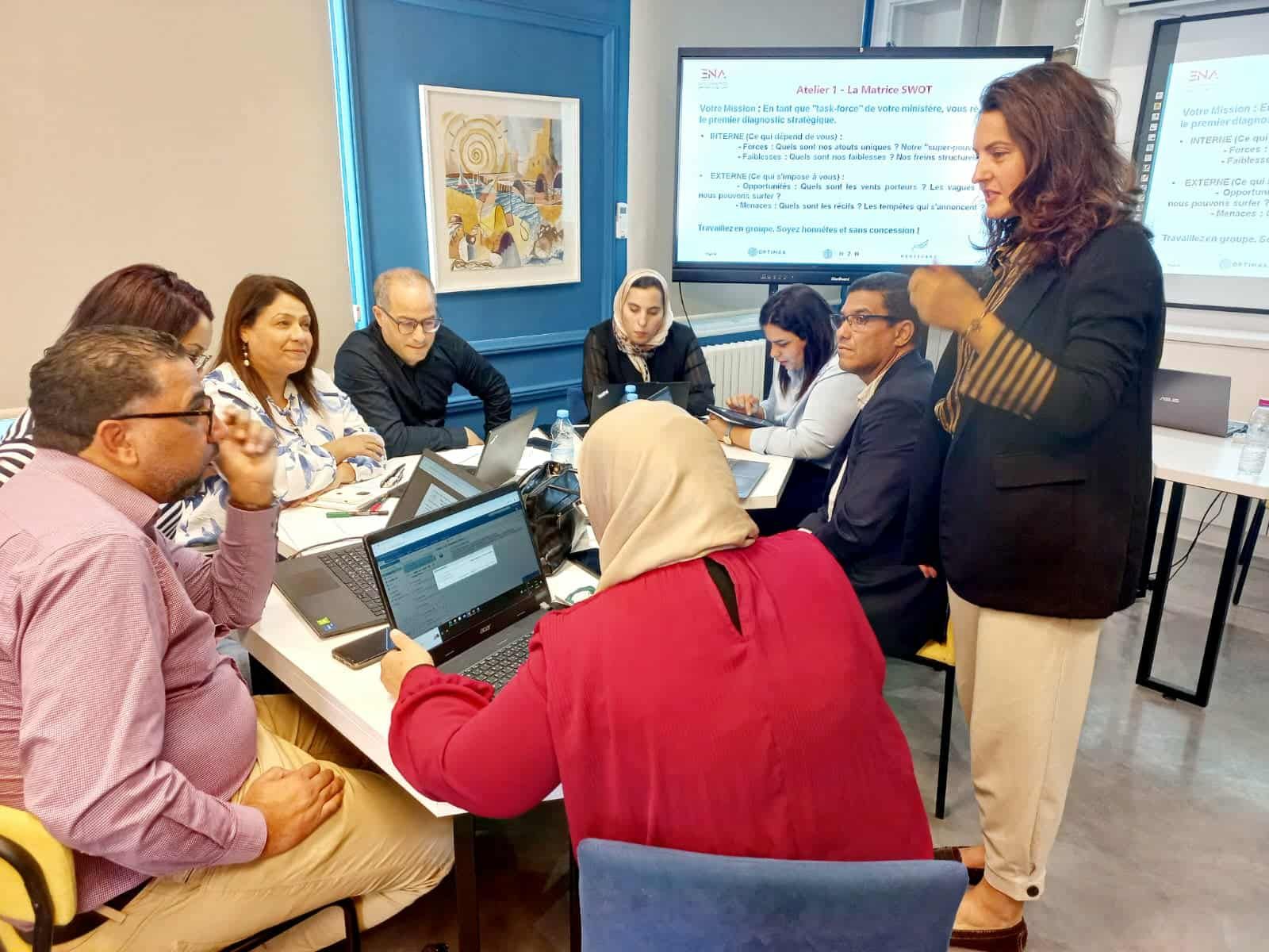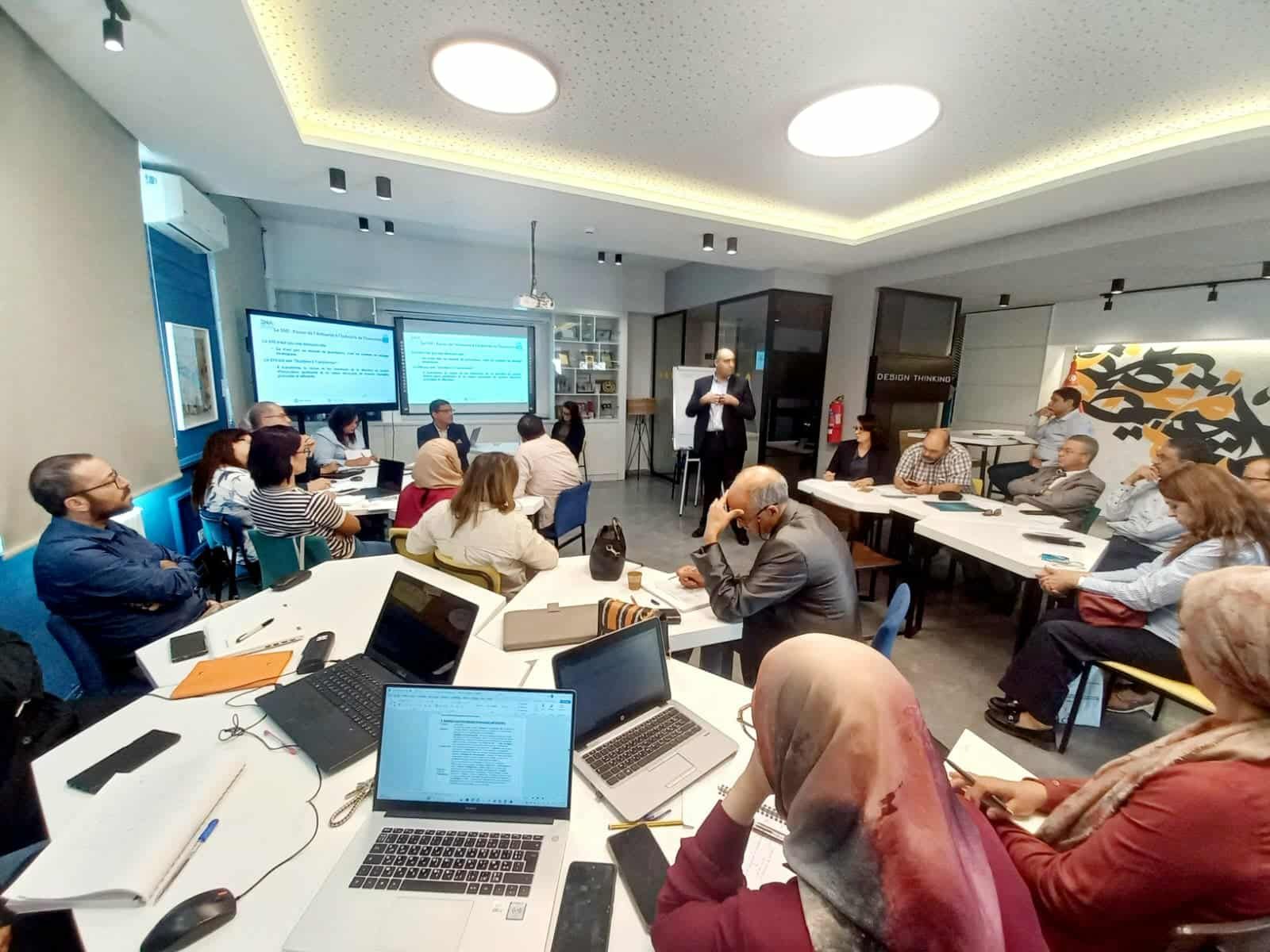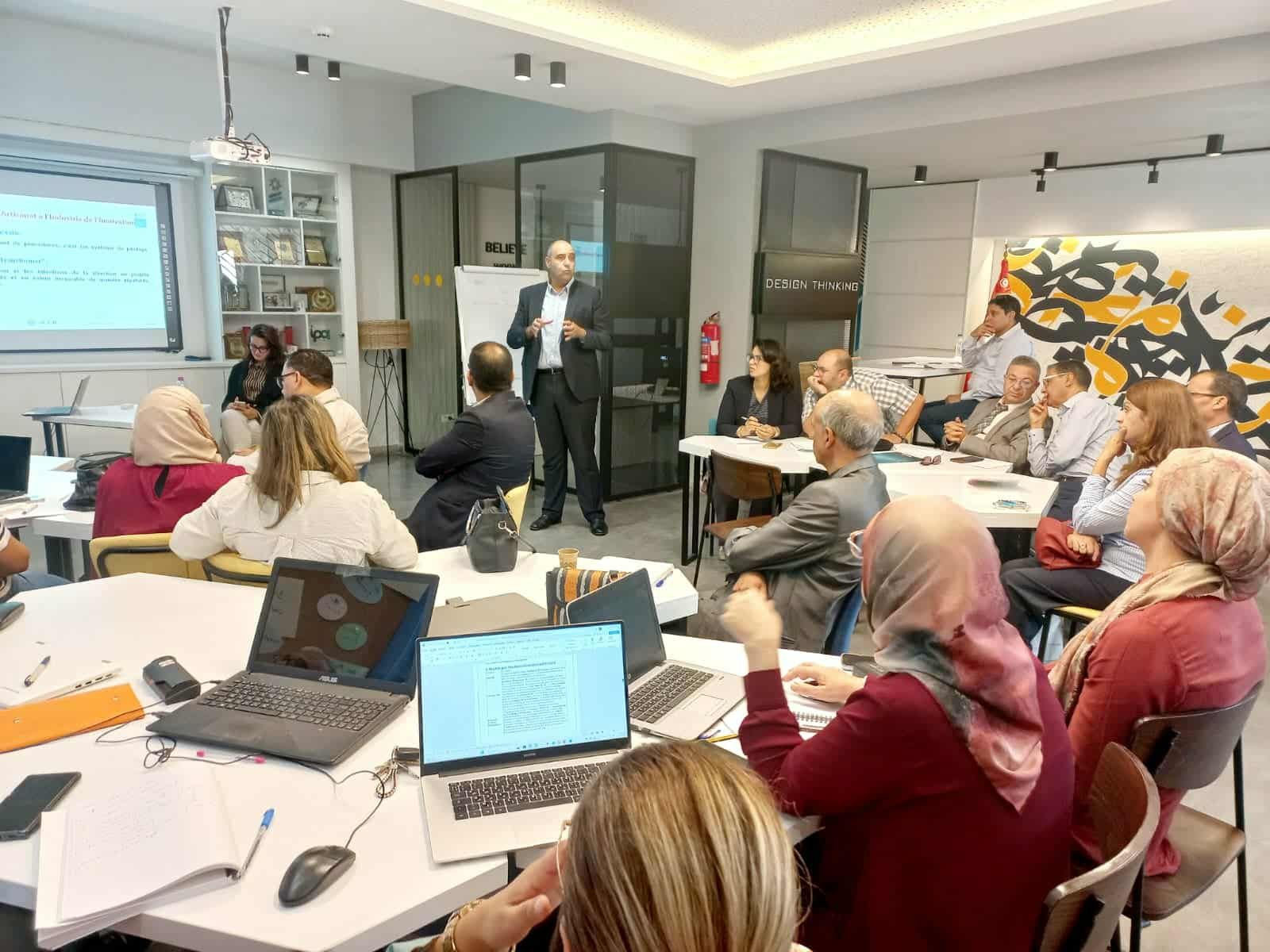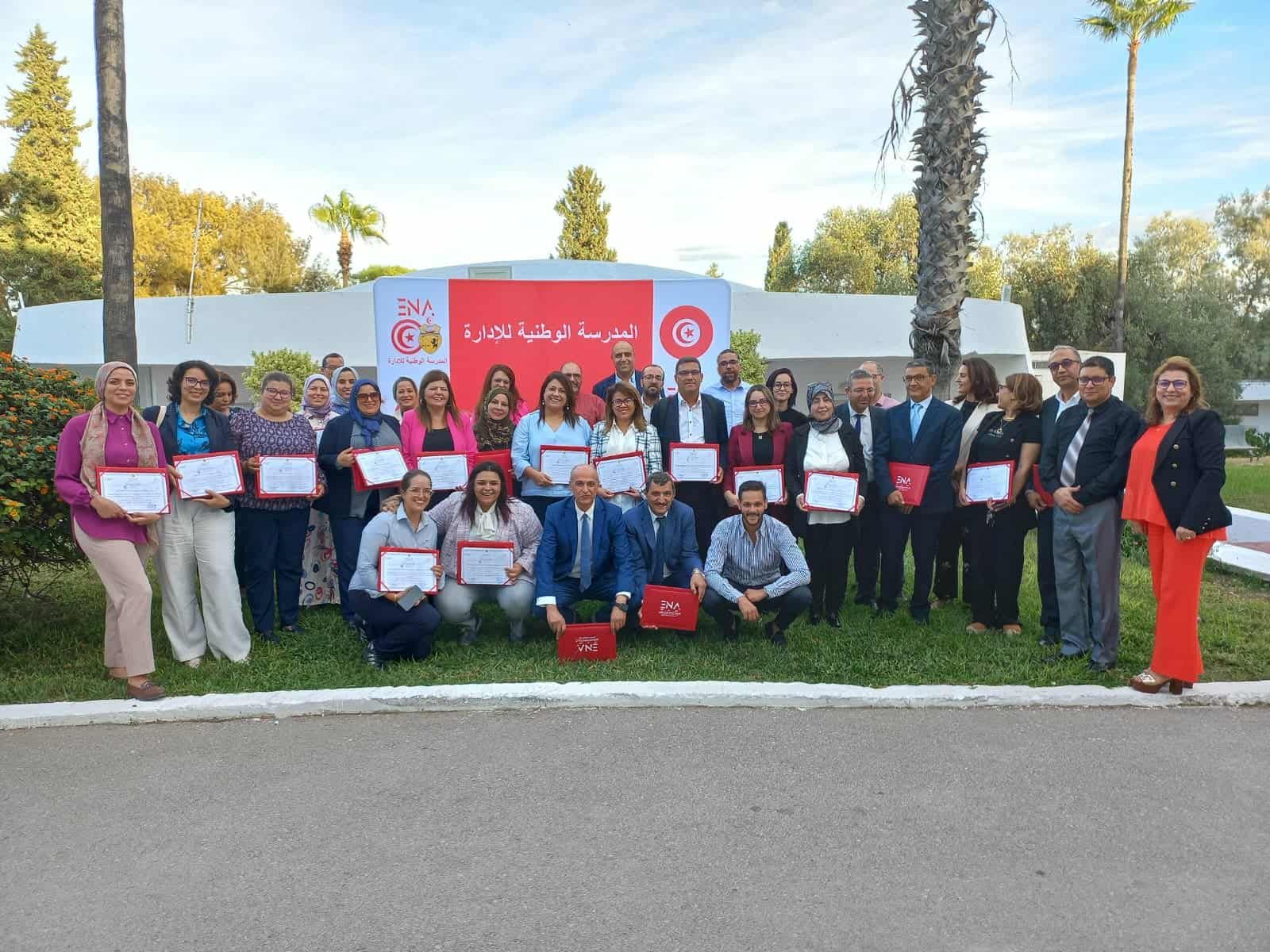 في إطار مواصلة برنامج الدورات التكوينية وورشات العمل الرامية إلى ترسيخ ثقافة التجديد في القطاع العمومي وتكوين فرق الابتكار اختتمت يوم الخميس 23 أكتوبر 2025 الدورة التكوينية المزدوجة(حضوريا وعن بعد عبر المنصة الوطنية للتكوين على الخط) للمستوى الثاني في شهادة “مدرب في الابتكار « innovation coach certificate » التي تم تنظيمها خلال الفترة الممتدة من 13 إلى 23 أكتوبر 2025 بمخبر التجديد في القطاع العام بالمدرسة الوطنية للإدارة وبالتعاون مع منظمة هانس سايدل الألمانية لفائدة 32 مشاركا ممثلين عن 15 وزارة ممن أتموا بنجاح المستوى الأول من البرنامج التكويني. وخصّصت هذه الدورة للتطرّق لموضوع إرساء نظام إدارة الابتكار في القطاع العامّ وفق المواصفات الدولية ISO 56001 ضمن مقاربة تشاركية تهدف إلى تمكين المشاركين من المفاهيم والمنهجيات الحديثة في مجال إدارة الابتكار، وتعزيز قدراتهم على تطبيق مقاربة منهجية ومستدامة لنشر ثقافة الابتكار داخل الهياكل العمومية. وتم خلال هذه الورشات التطبيقية بلورة تصوّرات عملية لمشاريع موجهة إلى إرساء منظومة للتجديد والابتكار