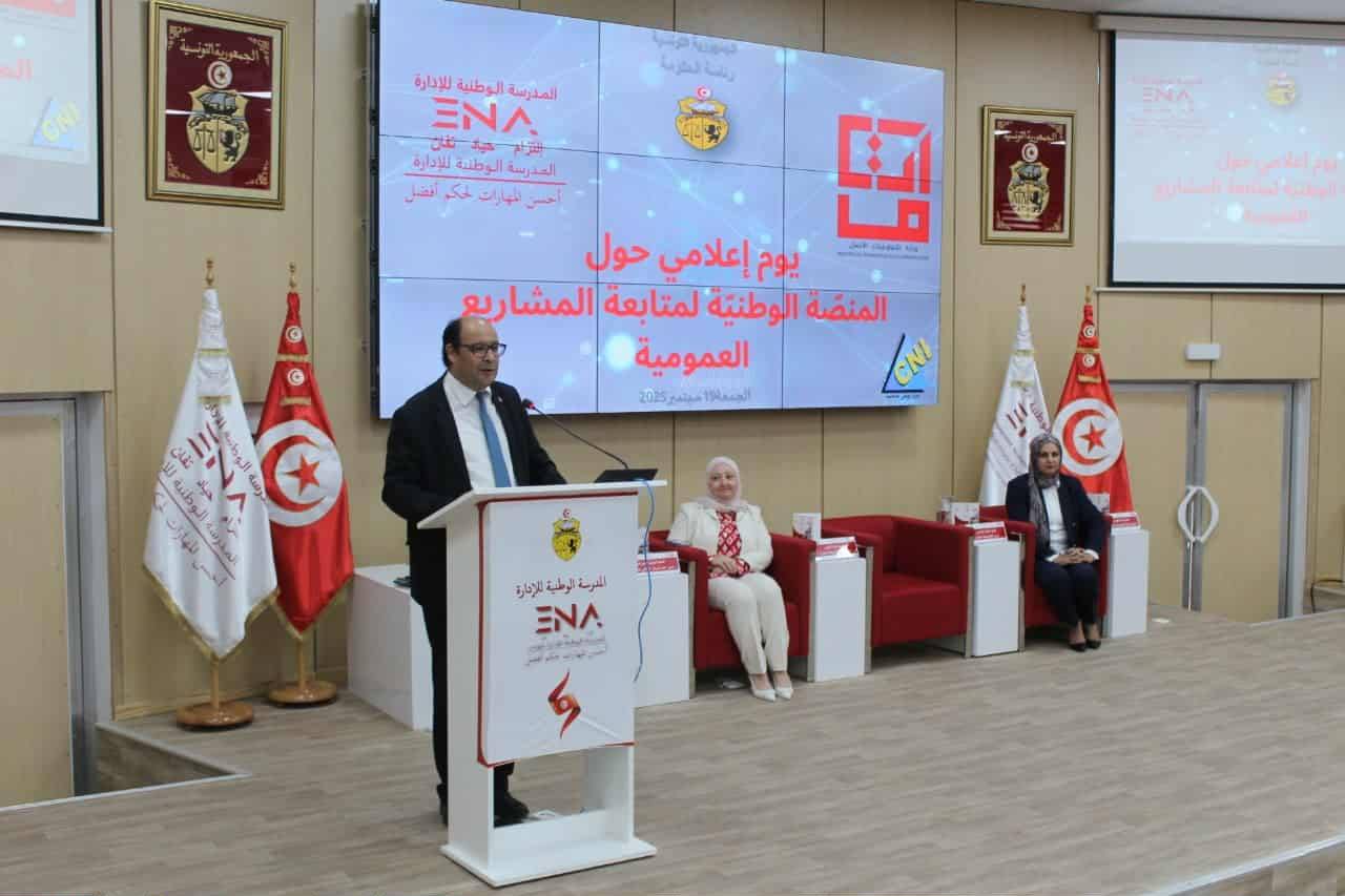 احتضن مقر المدرسة الوطنية للإدارة يوم الجمعة 19 سبتمبر 2025 فعاليات اليوم الإعلامي الذي تم تنظيمه بالتعاون مع وزارة تكنولوجيات الإتصال للتعريف بالمنصة الوطنية لمتابعة المشاريع العمومية.